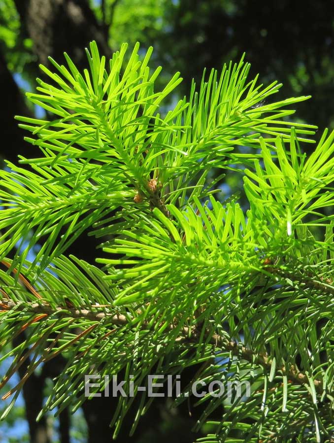 Хвоя молодых побегов – светло-зеленая, позже она темнеет и приобретает темно-зеленый цвет. Бархатистая, словно нарезанная бумага, она густо и беспорядочно покрывает ветви. Хвоинки плоские и мягкие, они тупоконечные и с нижней стороны имеют две беловатые полосочки.