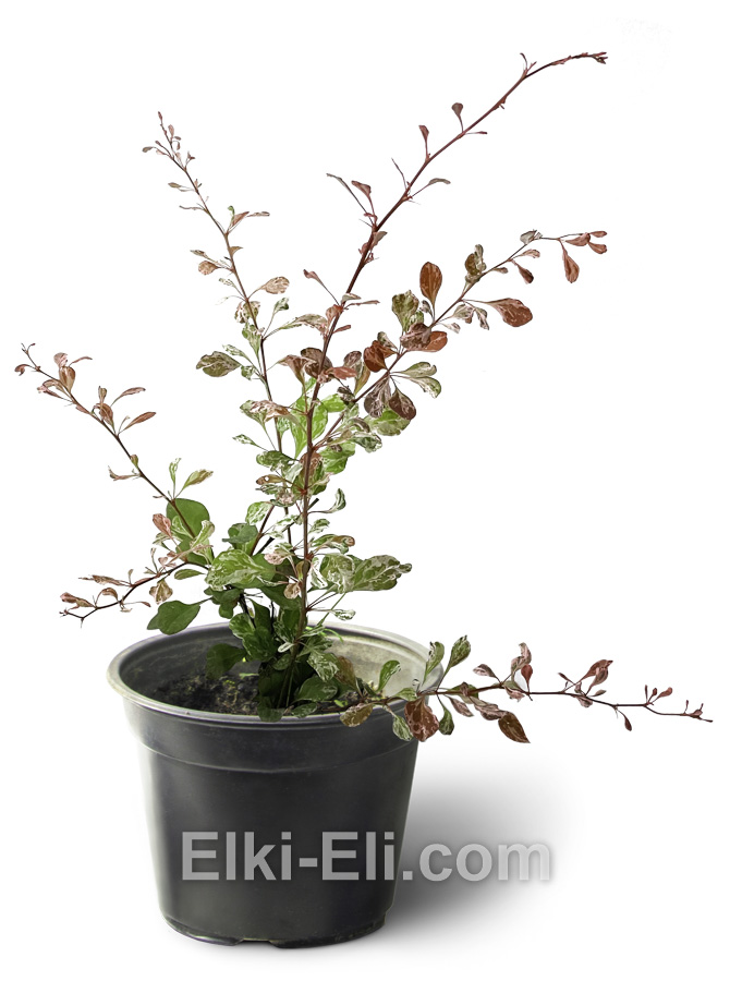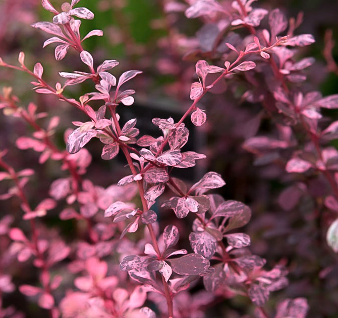 Барбарис Тунберга ‘Harlequin’ в горшке — эффектный декоративный кустарник с пёстрой листвой, на которой сочетаются розовые, белые и пурпурные пятна. Весной кустарник оживает свежими яркими красками, летом сохраняет мраморный рисунок листвы, а осенью листья приобретают тёплые багряно-красные и пурпурные тона. В мае он зацветает жёлтыми цветками, а в конце лета украшается ярко-красными ягодами, сохраняющими декоративность до зимы.