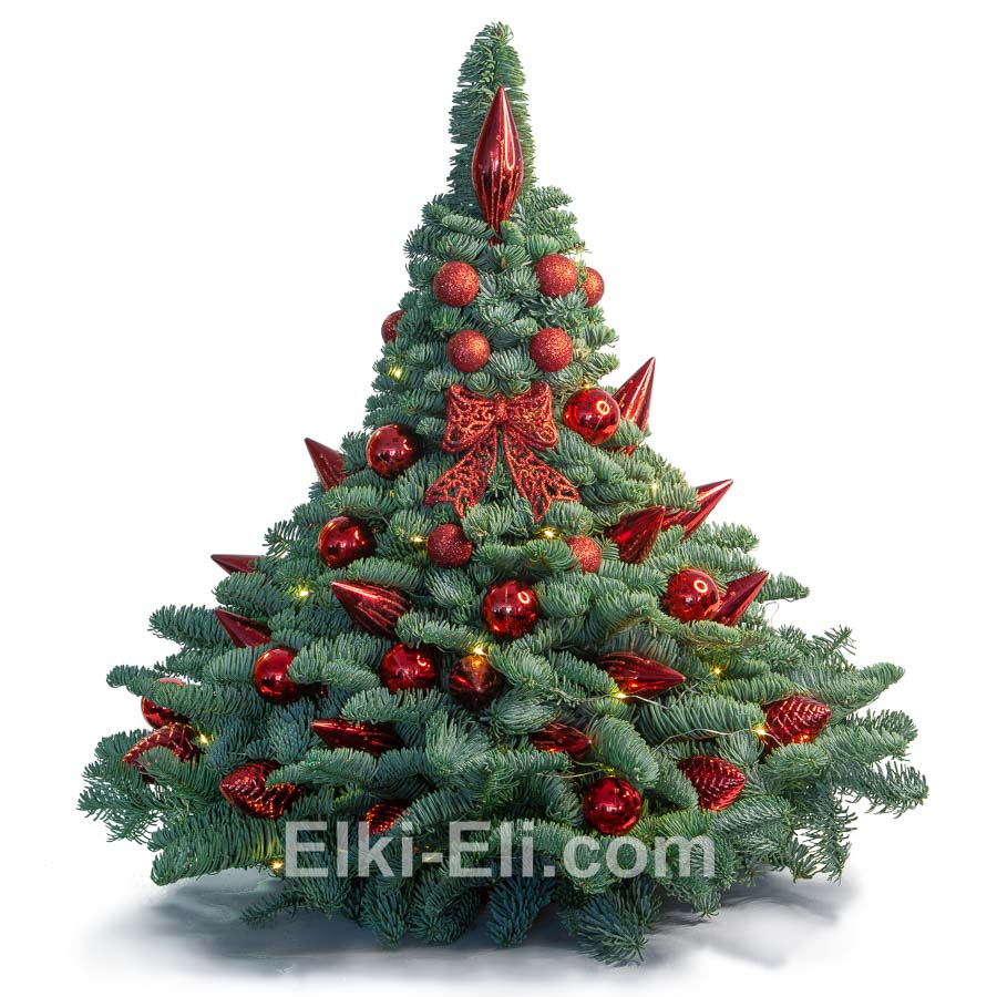 Настольная дизайнерская елочка премиум-класса – уникальная композиция, выполненная из живых веток пихты Нобилис, украшенная ярко-красными и бордовыми игрушками, а также сверкающей гирляндой цвета вечернего солнца. Размеры елочки 40-60 см. Дизайн может быть по желанию Заказчика изменён.