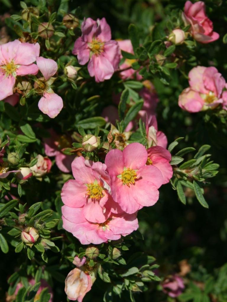 Лапчатка кустарниковая Lovely Pink — это компактный кустарник высотой до 70 см с густой изумрудной листвой и нежными розовыми цветами. Диаметр куста достигает примерно 70 см, а побеги за год вырастают до 15 см.