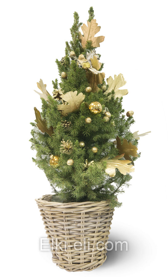 Растения могут быть представлены в различных упаковках с любыми цветовыми решениями (красная, синяя, золотистая, серебряная, темно-зеленая и др.), кашпо пластиковые и керамические, плетеные корзины, мешковина, подарочный пакет и т.д.<br /> <br /> Украшения на продукции доступны в разных цветовых гаммах: красные, синяя, золотистая, серебряная, темно-зеленая. При необходимости наши специалисты могут создать подарочные елочки по индивидуальному дизайну с учетом пожеланий и требований клиента.<br /> <br /> В продаже также имеются срезанные живые новогодние деревья, лапник, декоративные праздничные венки и хвойные деревья с комами земли для высадки на участок.