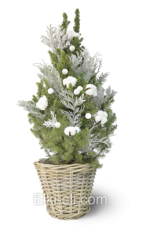 Растения могут быть представлены в различных упаковках с любыми цветовыми решениями (красная, синяя, золотистая, серебряная, темно-зеленая и др.), кашпо пластиковые и керамические, плетеные корзины, мешковина, подарочный пакет и т.д.<br /> <br /> Украшения на продукции доступны в разных цветовых гаммах: красные, синяя, золотистая, серебряная, темно-зеленая. При необходимости наши специалисты могут создать подарочные елочки по индивидуальному дизайну с учетом пожеланий и требований клиента.<br /> <br /> В продаже также имеются срезанные живые новогодние деревья, лапник, декоративные праздничные венки и хвойные деревья с комами земли для высадки на участок.