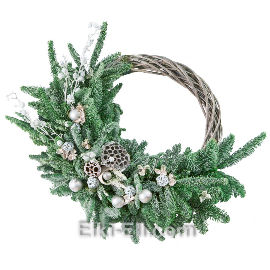 Новогодний венок «Рождественский иней» наполнен сказочными, седыми от мороза лапами новогодней елки, ветвями кустарников и дарами волшебного леса. Сдержанная, серебристая цветовая палитра и используемые материалы дают возможность применения новогодней композиции в интерьерах, оформленных, например, в Скандинавском или Эко-стиле. Натуральная основа из лозы и лапника пихты Нобилис – прочная и легкая. По желанию заказчика хвойный венок может быть выполнен в разных размерах и дополнен искусственным снегом и/или светодиодной гирляндой.