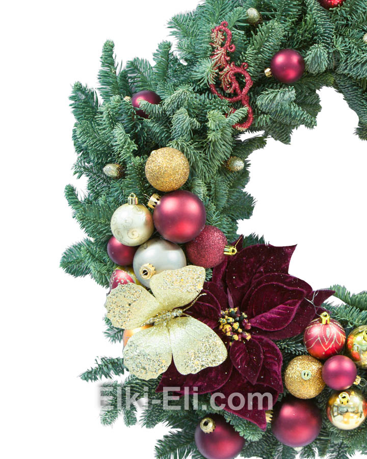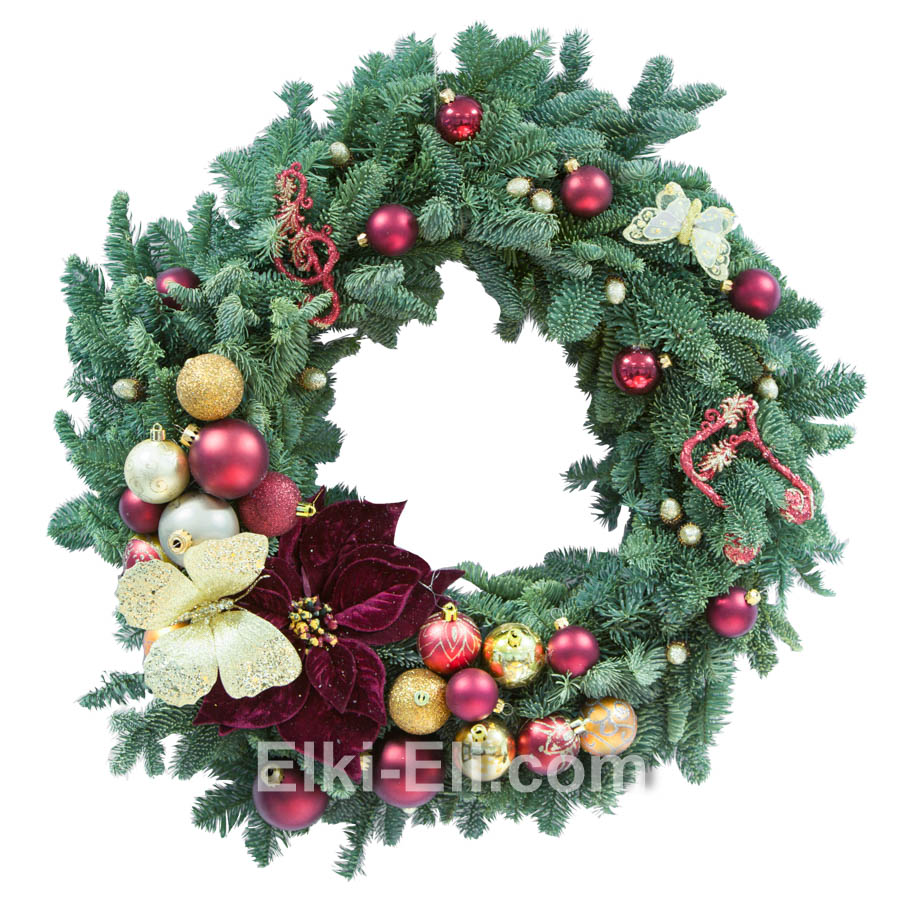 Венок «Рождественское вдохновение» — это музыка Рождества. Богатая, бордово - золотистая цветовая гамма композиции, традиционная для праздника, и используемые для создания венка материалы подойдут для украшения как дома, так и входной зоны. Основа рождественского венка - лапник пихты Нобилис. Декоративные элементы: цветок, бабочки, игрушки, скрипичный ключ, ноты, желуди. Рождественский венок может быть выполнен в разных размерах и дополнен и праздничной гирляндой и (или) искусственным снегом.