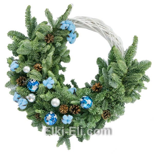 Если вы приняли решение купить новогодний венок, то вам определенно стоит обратить свое внимание на венок «Зимний сон». Белая основа, выполненная из ивовой лозы, напоминает о белоснежных сугробах за окном. Зеленые, бархатистые лапы пихты Нобилис, покрытые неколючей, долго не осыпающейся хвоей, настраивают на спокойный лад. Необычные голубые цветы, выполненные из коробочек хлопчатника, и блестящие синие шары с серебряными звездами принесут сказочное настроение, настроят на легкость и безмятежность. Благородный и сдержанный терракотовый цвет шишечек сосны расставит акценты. Все декоративные элементы стабильны и не требуют ухода.